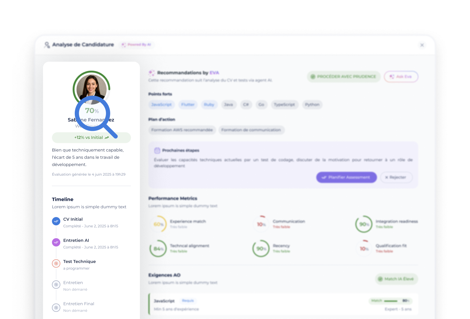 À la fin de chaque test ou entretien, notre IA génère un rapport complet offrant une vision claire et exploitable de vos résultats. Vous identifiez vos points forts, vos axes d’amélioration et recevez des recommandations concrètes pour progresser.